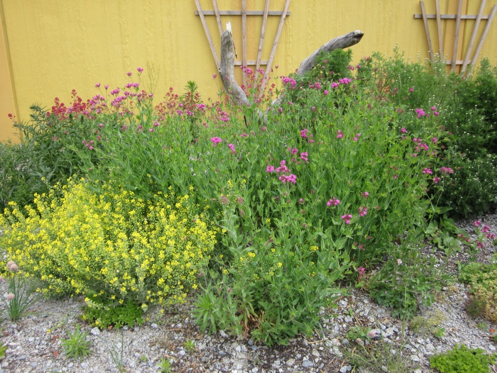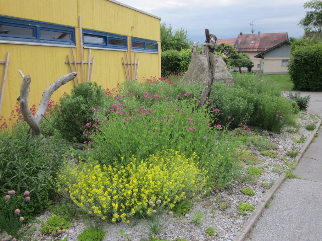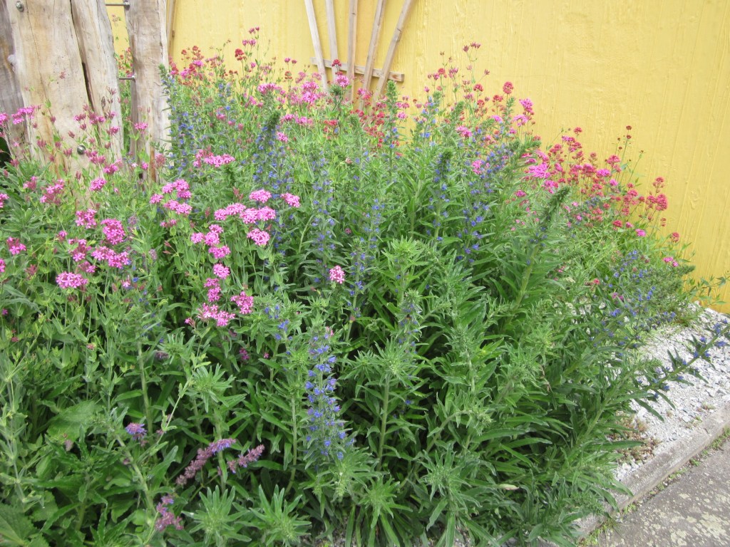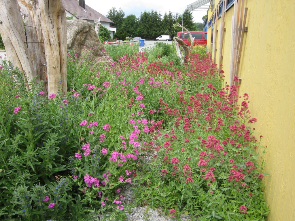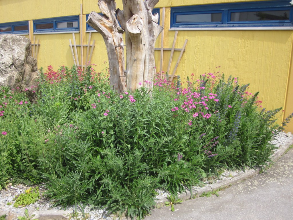 Nach nur einem Jahr haben sich die Ansaaten prächtig gemacht. Natternkopf, Quirlblütiger Salbei, Spornblume, Färberkamille und Nelkenleimkraut blühen.